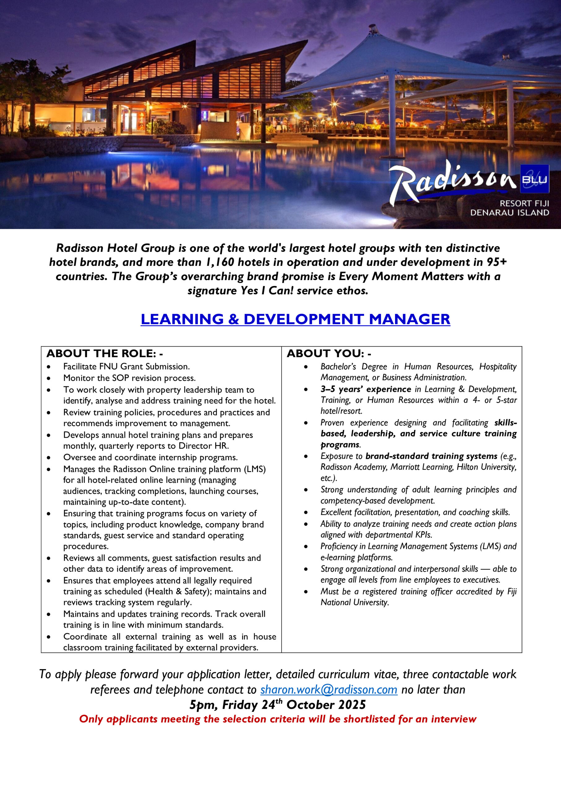 To apply please forward your application letter, detailed curriculum vitae, three contactable work referees and telephone contact to sharon.work@radisson.com no later than
